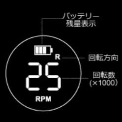 本体中央に大きくディスプレイを搭載。回転数とバッテリーの残量が一目でわかります。