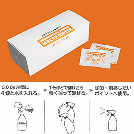 本製品1 袋分(4 錠)を500mlの水に溶かすだけで弱酸性次亜塩素酸水を生成できる発泡タブレットです。次亜塩素酸水の優れた除菌・消臭力、安全性はそのままに、液体で流通する次亜塩素酸水の弱点を克服し「保存性・扱いやすさ・軽量化・省スペース」を劇的に向上させたのが、HACCP WATER tabです。
