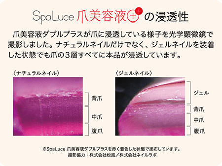 2024年12月、「SpaLuce 爪美容液プラス」は「SpaLuce 爪美容液ダブルプラス」としてリニューアル・新発売しました!SpaLuce爪美容液ダブルプラスは、爪の保湿・補修・保護により一層こだわり、厳選した美容成分・保湿成分を配合しました。健やかで美しいナチュラルネイルを育成し、ネイルを施した指先の美しさも持続させます。